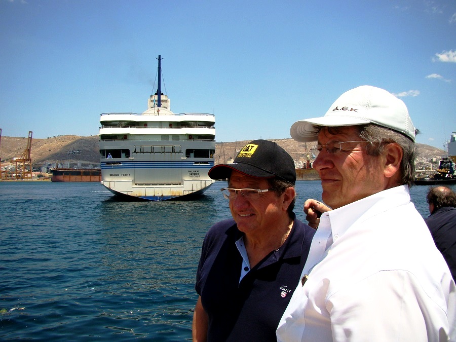 Ο Δημήτρης και ο Γιώργος Στεφάνου κατά την άφιξη από την Ιαπωνία του Superferry III στην Δραπετσώνα τον Ιούνιο. Όπως βλέπουμε ήταν ένα άλλο πλοίο τότε.