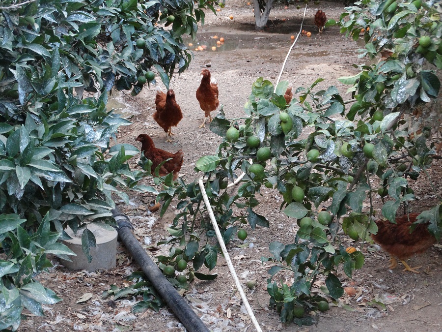 Και 300 κότες!!! Διάσπαρτες ανάμεσα σε λεμονιές και πορτοκαλιές. Με τις κουτσουλιές τους λιπαίνουντα δέντρα που είναι κατάφορτα από καρπούς. Τα αυγά πάνε στο οικογενειακό κρεοπωλείο στο Κόρθι (φωτ. Εν Άνδρω).
