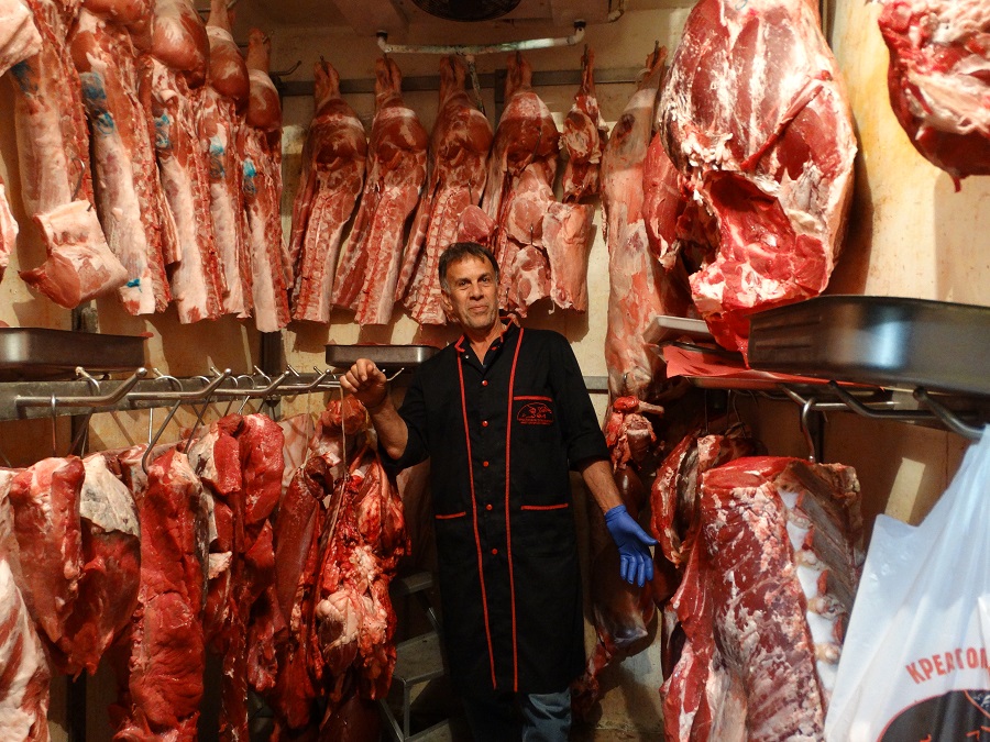 Εδώ ο Σταύρος στο ψυγείο με τα κρέατα στο οικογενειακό κρεοπωλείο στον Όρμο. Όλα τα κρέατα και τα παράγωγά τους (λουκάνικα κλπ) είναι παραγωγή τους (φωτ. Εν Άνδρω).