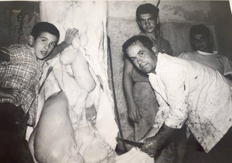 Σκηνή σφαγής στο οικογενειακό αγρόκτημα στο Κόρθι στη δεκαετία του 1960. Ο πατέρας του Νίκου και του Σταύρου σφάζει με την βοήθεια των παιδιών του. Ο Σταύρος μπροστά βοηθά τον πατέρα του. Ήταν πάντα πιο ενεργητικός στο σφαγείο όπως λέει ο ανηψιός του Γιώργος Ζαγοραίος.