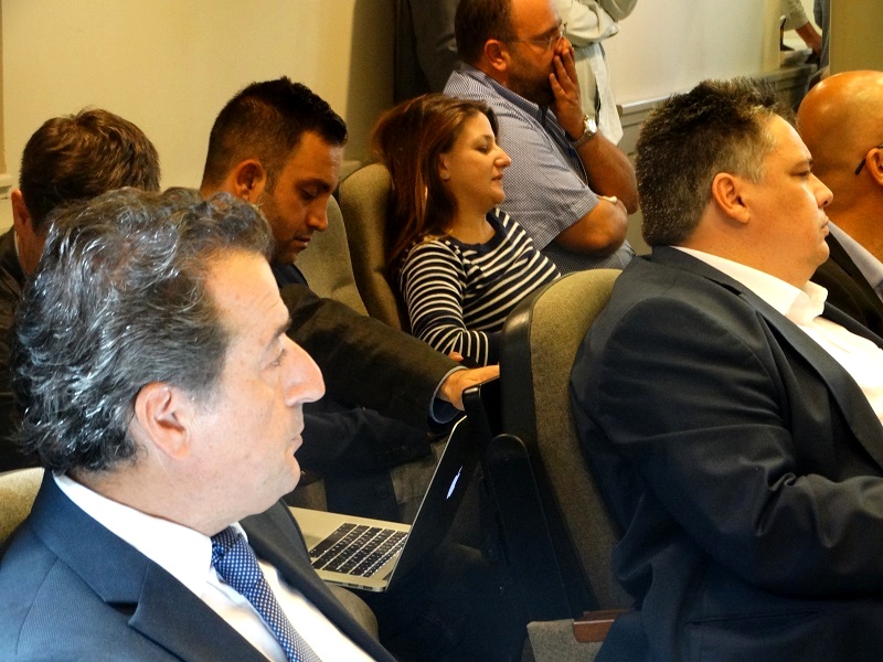 Οι αντιπεριφερειάρχες Δωδεκανησου και Κυκλάδων μπροστά. Πίσω δεξιά ο πρόεδρος της Ένωσης Επιχειρήσεων Ακτοπλοΐας και Διευθύνων Σύμβουλος της Blue Star Ferries Μιχάλης Σακέλης εκ των βασικών εισηγητών της σύσκεψης.Πιο πίσω διακρίνεται και ο Β.Αδάμης της Sea Jets.