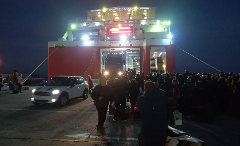 Ακόμε ξεφορτώνει ΙΧ και φορτηγά το πλοίο, ενώ ήδη έχουν αρχίσει να επιβιβάζονται οι επιβάτες για τα τρια νησιά (φωτ. Εν λΑνδρω).