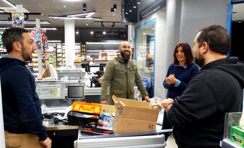 Η ομάδα που θα φτιάξει την γωνιά "έτοιμου ζεστού φαγητού" ετοιμάζεται για το έργο συζητώντας με την περιφερειακή διευθύντρια της εταιρείας (φωτ. Εν Άνδρω).