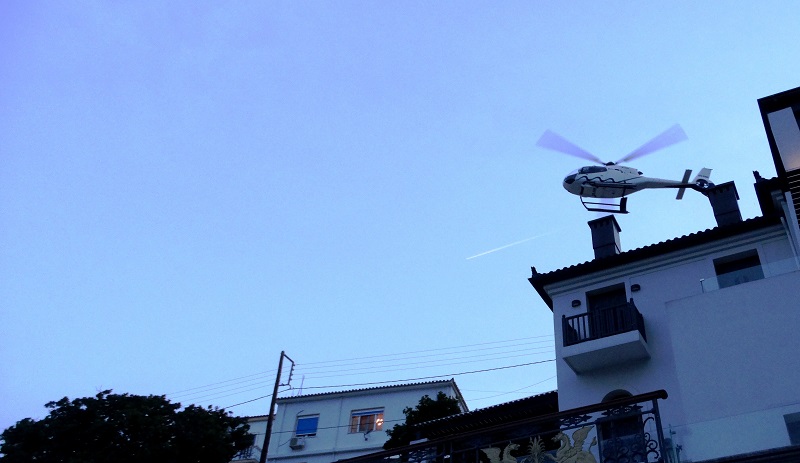 Όπως είπαμε παραπάνω λόγω της μέρας η Χώρα είχε ακόμα αρκετό κόσμο. Πολλοί ήταν αυτοί που αναρωτήθηκαν όταν είδαν ένα μικρό ιδιωτικό ελικόπτερο να περνά αργά το απόγευμα πάνω από την μικρή πολή, να προσπερνά μετά την πλαγιά πάνω από την Αγία Τριάδα και να κατεβαίνει σε ιδιωτικό ελικοδρόμιο στις Στενιές.