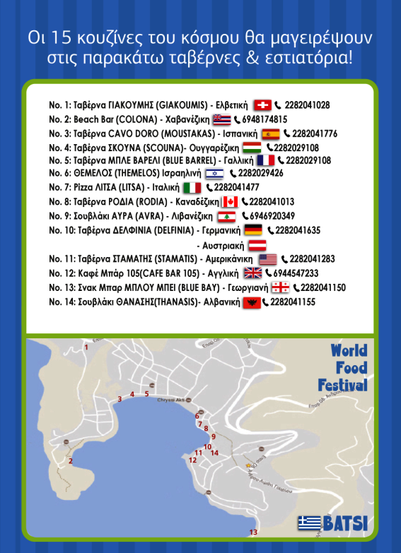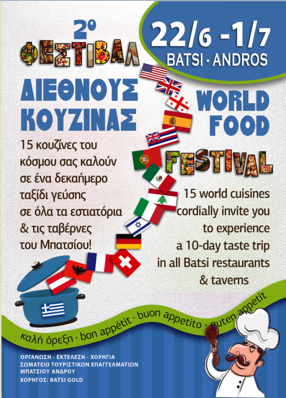 Άνοιξε το Μπατσί και από Παρασκευή ξεκινά και το 10ήμερο διεθνούς κουζίνας του Σωματείου Τουριστικών Επαγγελματιών Μπατσίου. Δεκαπέντε κουζίνες του κόσμου επί δέκα μέρες στα εστιατόρια και τις ταβέρνες του Μπατσίου θα ξεναγούν τους επισκέπτες σε γεύσεις από διάφορα μέρη του κόσμου. Αναρτούμε και την αφίσά τους και θα κάνουμε και μια βόλτα να τις δούμε από κοντά όπως και πέρσι. Μην ξεχάσετε από την Παρασκευή 22/6 μέχρι Κυριακή 1/7...