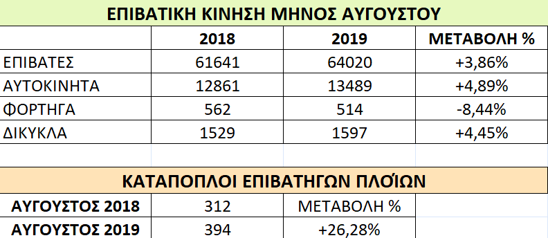 Συνολικά μπορούμε να πούμε πως η εικόνα της θερινής περιόδου του 2019 – με την ολοκλήρωση και του Αυγούστου παρουσιάζει αύξηση σε αριθμούς. Ήτοι, θετικός ο Ιούνιος, σε κάμψη - λόγω εκλογών - ο Ιούλιος και σε άνοδο ο Αύγουστος. Όχι πολύ μεγάλα νούμερα, αλλά υπάρχει άνοδος που προέρχεται κυρίως από τον ανταγωνισμό των εταιρειών που εκφράστηκε με την σταθερή προσέγγιση των ταχυπλόων και τα αυξημένα κατά τι συμβατικά δρομολόγια.
