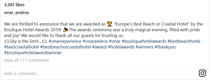 «Είμαστε ενθουσιασμένοι που θα σας ανακοινώσουμε ότι απονέμεται ως το "Καλύτερο παραλιακό ή παράκτιο ξενοδοχείο της Ευρώπης" από τα Boutique Hotel Awards 2019! Η τελετή απονομής των βραβείων ήταν μια πραγματικά μαγευτική βραδιά γεμάτη με υπερηφάνεια και χαρά! Θα θέλαμε να ευχαριστήσουμε όλους τους επισκέπτες μας για την εμπιστοσύνη».