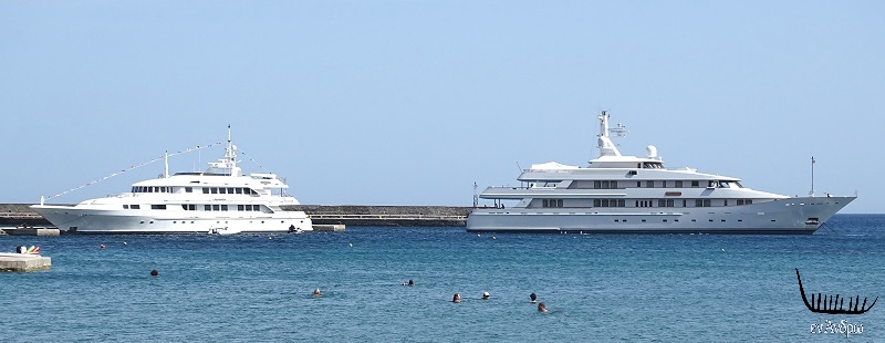 Το Super Yacht έκανε μια σειρά ελιγμούς ρίχνοντας άγκυρα και προσεγγίζοντας αργά την εξωτερική προβλήτα του λιμανιού. Ακριβώς δίπλα στο γιώτ του Αδαμαντίου Πολέμη που είναι όπως και ο ιδιοκτήτης του εκεί εδώ και καιρό. Το μεγάλο σκάφος προσέγγισε αργά με την πρύμη κι ακούμπησε απαλά την προβλήτα θέλοντας κάποιον να αποβιβάσει. Οι τακτικοί της παραλίας και οι κολυμβητές αναρωτήθηκαν ποιο σκάφος ήταν και σε ποιον ανήκε.