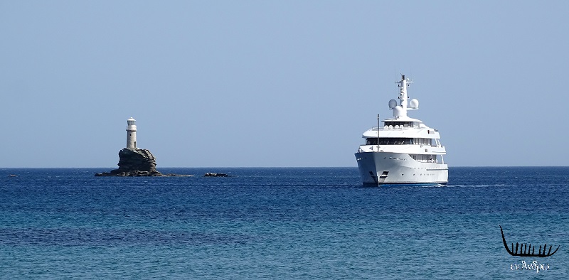 Γνώστης των πραγμάτων, παραθεριστής που έπινε τον καφέ του στου Στυλιανού, εξήγησε στους διπλανούς του πως επρόκειτο για το σκάφος KWIKUMAT (Κουϊκουμάτ) ιδιοκτησίας Πέτρου Γουλανδρή. Είχε έρθει για σύντομη ιδιωτική επίσκεψη του ιδιοκτήτη του στην πατρική Χώρα Άνδρου.