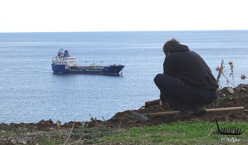 Καθώς μπαίνει στο λιμάνι ο εργάτης του Δήμου που φυτεύει σειρά από πικροδάφνες για να ομορφύνει η αλάνα δίπλα στον βιολογικό το κοιτά με απορία. Αυτός που φυτεύει και το πλοίο που μπαίνει στο λιμάνι είναι οι μόνοι που κινούνται μέσα στο ακίνητο σύμπαν της πανδημίας αυτό το πρωινό της Παρασκευής...