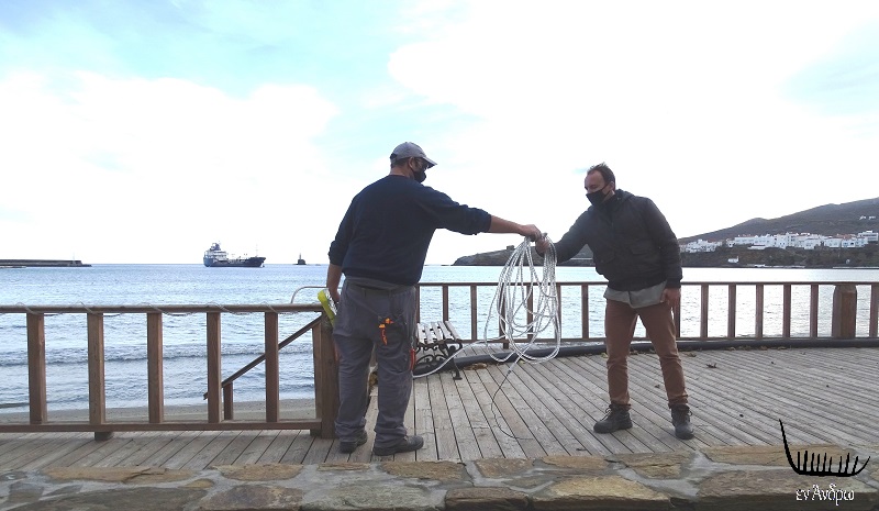 Στην πεζογέφυρα δύο εργάτες του Δήμου - υπό την επίβλεψη του Δ. Γιαννίση - απλώνουν δεκάδες μέτρα φωτεινές κουλούρες για να την φωτίσουν γιορτινά για τα Χριστούγεννα.  Δύο ακόμα εργαζόμενοι στο ακίνητο σύμπαν της Άνδρου. Πίσω τους το μικρό μότορσιπ κάνει ελιγμό για να δέσει...