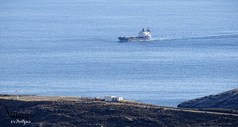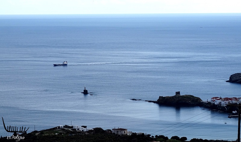 Πρωινό Παρασκευής και στο ορίζοντα ένα πλοίο ανηφορίζει από Κόρθι προς Χώρα. Να είναι άραγε κάποιο ανδριώτικο που περνά για να χαιρετίσει το νησί; Ή, μήπως κανένα μότορσιπ που φέρνει πράγματα στην Χώρα. Μοιάζει πετρελαιοφόρο. Κάποια εταιρεία φέρνει καύσιμα στο νησί. Να που έρχονται πλοία μες την πανδημία και στη Χώρα. Τραβάς μερικές φωτογραφίες Και μπαίνεις στο αυτοκίνητο για το λιμάνι. Τέτοια εποχή ακινησίας ότι κινείται είναι είδηση. Πόσο μάλλον όταν ενδιαφέρει την Άνδρο, αλλά όπως θα δούμε παρακάτω και το Εν Άνδρω...