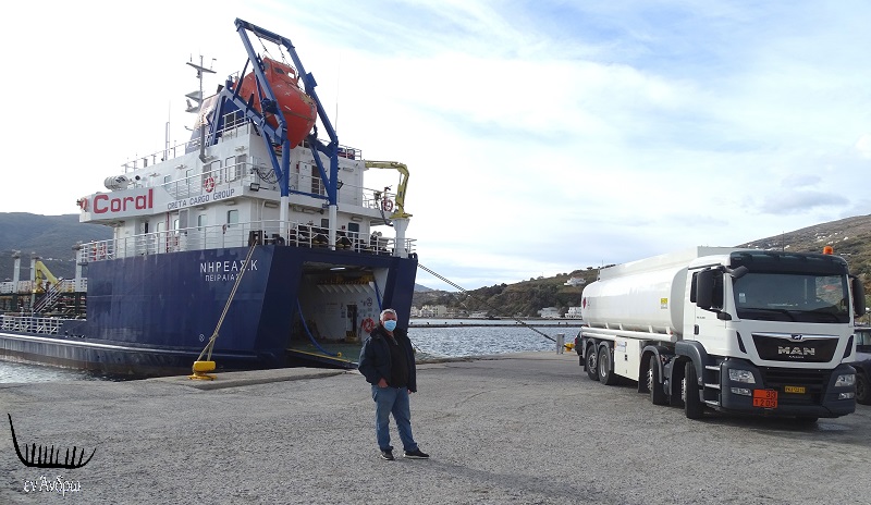 Το μότορσιπ ΝΗΡΕΑΣ Κ. της εταιρείας Κουμανάκη μεταφέρει καύσιμα από την Motor Oil του Βαρδινογιάννη. Από τα δύο βυτιοφόρα σήμερα έχει το ένα μόνο. Διανέμει καύσιμα Shell & Avin. Ο καπετάν Κώστας, από την Αρκαδία (!) - στη φωτογραφία - επιβλέπει την εκφόρτωση και την διανομή. Ρωτά για την φωτογράφηση. Του λέμε για το Εν Άνδρω. Και μένουμε έκπληκτοι: το ξέρει!!! Του έχει μιλήσει και του το έχει δείξει ο αρχικαπετάνιος της κρητικής εταιρείας που είναι... ανδριώτης! Πέσαμε σε αναγνώστες !!! Σήμερα θα είναι στη Νάξο. Του ευχόμαστε από εδώ καλό ταξίδι και καλή θάλασσα...