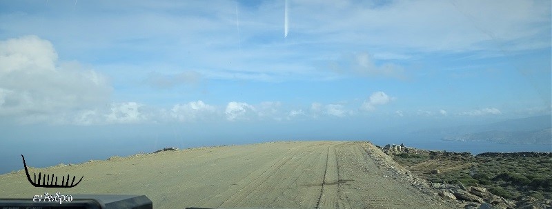 Ο νέος 12μετρος δρόμος που διανοίχτηκε στην περιοχή. Αν η Άνδρος είχε τέτοιο δρόμο να συνδέει το Γαύριο με την Χώρα το ταξίδι των 35 χιλιομέτρων θα συντόμευε κατά 7-8 χιλιόμετρα και κατά ένα τέταρτο της ώρας. Όμως όταν έγινε η χάραξη του υπάρχοντος δρόμου Χώρας-Γαυρίου - προπολεμικά και όταν βελτιώθηκε μεταπολεμικά - ήταν άλλες οι δυνατότητες και άλλες οι προδιαγραφές. Γι΄ αυτό και γράψαμε στον τίτλο του οδοιπορικού μας στο Στενό "αυτοκινητόδρομοι της αύριον"...