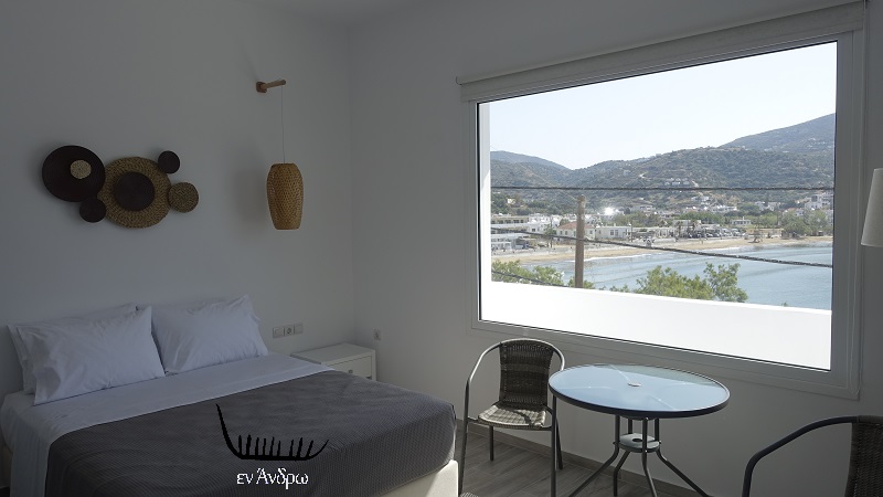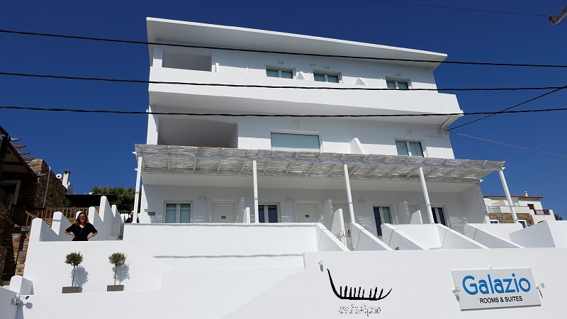 Το ξενοδοχείο "Γαλάζιο" άλλαξε, ανακατασκευάστηκε, ομόρφυνε και ξεκίνησε υπό νέα διεύθυνση. Ο Βαγγέλης Μιχαήλ, ο νεαρός ιδιοκτήτης του, μας πήρε τηλέφωνο πριν λίγες μέρες ζητώντας να το επισκεφθούμε και να το συστήσουμε εκ νέου στο νησί. Σκεφτήκαμε πως η αγορά και η ανακαίνιση του παλιού ξενοδοχείου από ένα νέο άνθρωπο και την οικογένεια του - που έχουν καταγωγή από την Κατάκοιλο της Άνδρου - είναι ένα ακόμα βήμα για το νησί και πως κάθε νέα προσπάθεια αξίζει τον κόπο να προβληθεί στο νησί. Και πήγαμε μέχρι εκεί. Η πρώτη εντύπωση μακροσκοπικά θετική. Το κτίριο μιας κλασικής μοντέρνας αισθητικής της δεκαετίας του 1960 ξεχωρίζει λάμποντας στα λευκά.
