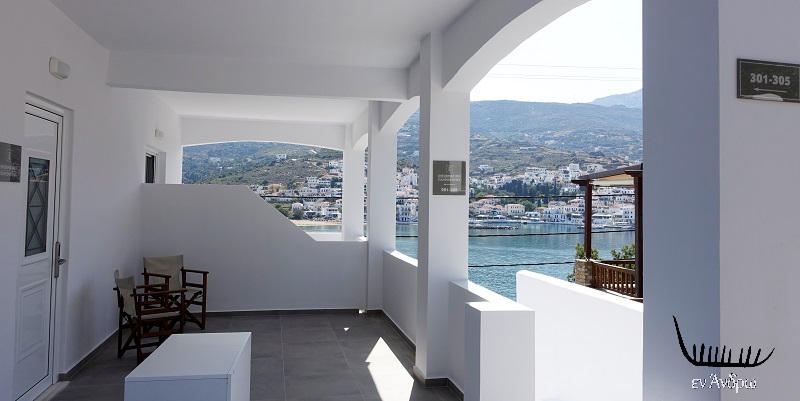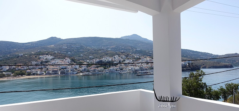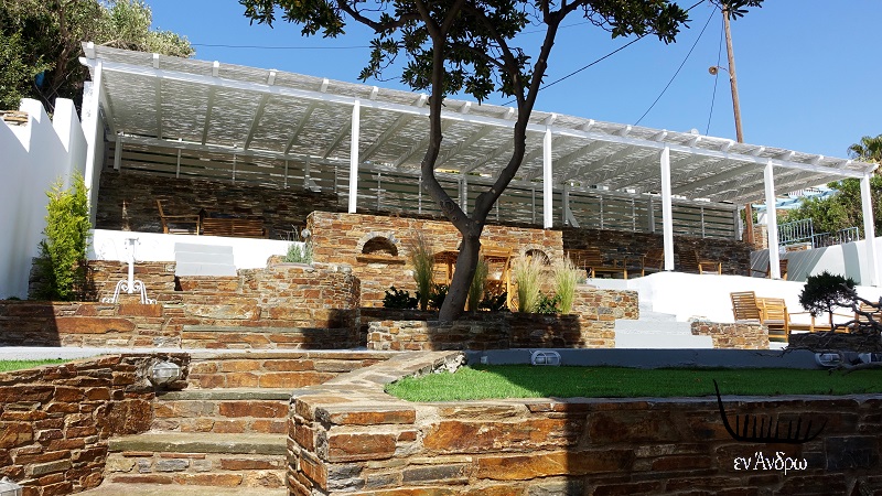 Στο πίσω μέρος του μικρού ξενοδοχείου εκεί που μέχρι πρότινος ήταν ένας άγριος κήπος τώρα είναι διαμορφωμένη μια εξαιρετική αυλή. Με πέτρινες καλοχτισμένες πεζούλες για το πρωινό των επισκεπτών. Οι άνθρωποι που αποφάσισαν να αλλάξουν ζωή φεύγοντας από την μεγάλη πόλη και επένδυσαν στην Άνδρο της καταγωγής τους έφεραν και μια νέα αισθητική για τον χώρο. Το Γαλάζιο έγινε... πιο Γαλάζιο από πριν!...