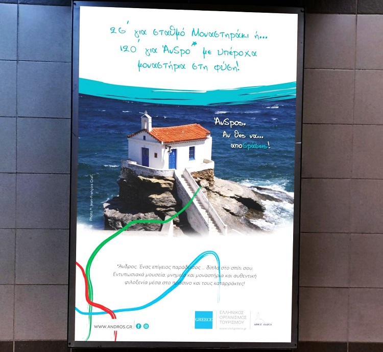 Σημειώνεται πως ξεκίνησε εχθές η νέα πρωτότυπη καμπάνια του Δήμου Άνδρου για την προβολή στην Αττική με slogan «Άνδρος… Αν θες να αποδράσεις!» Μέσα από 31 φωτιζόμενα πλαίσια σε 17 σταθμούς του Μετρό Αττικής, όπως για παράδειγμα Σύνταγμα, Εθνική Άμυνα, Αμπελόκηποι, Ευαγγελισμός, Μέγαρο Μουσικής, Πανόρμου και Πανεπιστήμιο, «ξετυλίγεται» για 14 ημέρες το  νέο σκεπτικό που «συγκρίνει» διάρκειες διαδρομών στην Αθήνα με το σύντομο ταξίδι δύο ωρών για τον επίγειο παράδεισο της Άνδρου και αναδεικνύει το φυσικό κάλλος, τις δραστηριότητες, τα μοναστήρια, τα γραφικά χωριά και άλλες πτυχές του προορισμού!