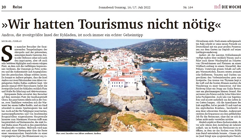 Τη θετική αύρα που εκπέμπει το νησί αναδεικνύει η «nd», μία ακόμη Γερμανική εφημερίδα που θεωρεί την Άνδρο εξαιρετική προσθήκη για όσους επισκέπτονται την Αθήνα και θέλουν να συνεχίσουν το ταξίδι τους στην ιστορία και τη φύση σε έναν μη συμβατικό προορισμό, που απέχει μόλις δύο ώρες από την πρωτεύουσα.