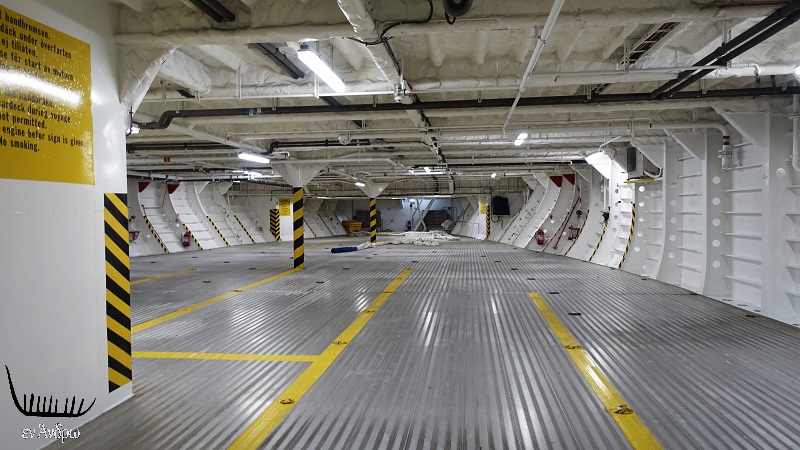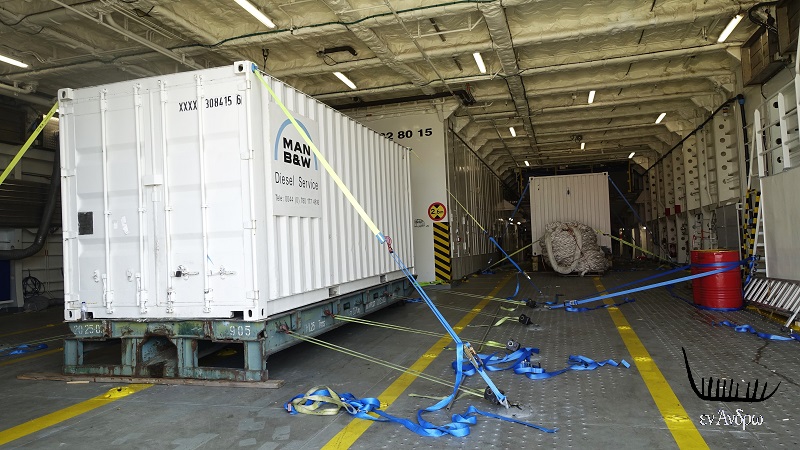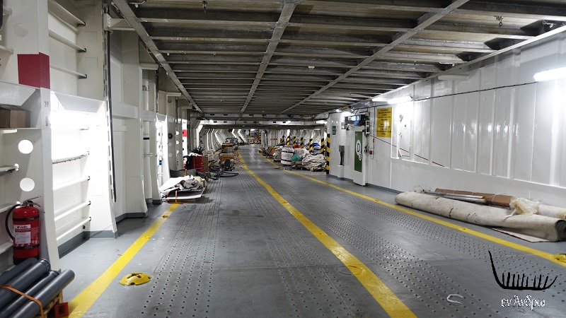 Μπήκαμε από τους πρώτους μόλις έδεσε. Το γκαράζ ήταν φορτωμένο με μηχανές και ανταλλακτικά, που θα χρειαστεί το πλοίο στο μέλλον.