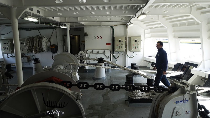 Είδαμε τους στεγασμένους - σε πλώρη και πρύμη - χώρους των μηχανημάτων πρόσδεσης των κάβων. Στο πλοίο αυτό οι ναύτες που χειρίζονται τους κάβους πρόσδεσης θα δουλεύουν σε στεγασμένο περιβάλλον...