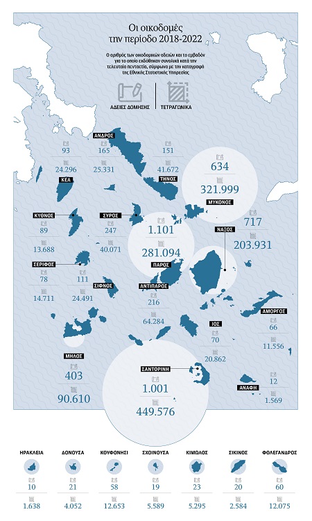 Η «Κ» εξετάζει σήμερα τα στοιχεία της Εθνικής Στατιστικής Υπηρεσίας για τη νέα δόμηση από το 2018 έως και το 2022 σε 23 κατοικημένα νησιά των Κυκλάδων (το μόνο κατοικημένο νησί που δεν εξετάζεται χωριστά είναι η Θηρασιά, επειδή η ΕΣΥΕ δεν παρέχει χωριστά στοιχεία για όλες τις χρονιές). Τα στοιχεία αφορούν άδειες για νέες οικοδομές και προσθήκες (χωρίς να διαχωρίζεται η χρήση τους). Οπως προκύπτει από την ανάλυση των στοιχείων: