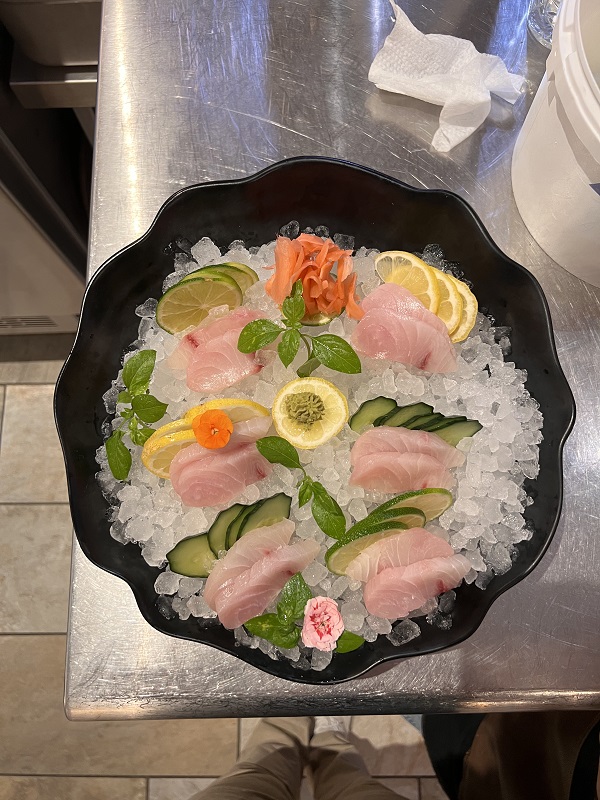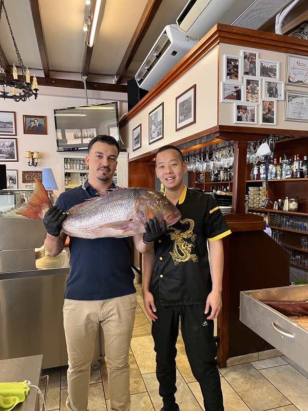 Ο νεαρός Σταμάτης μαζί με τον Ασιάτη μάγειρα για το σούσι ποζάρουν με την τεράστια συναγρίδα...