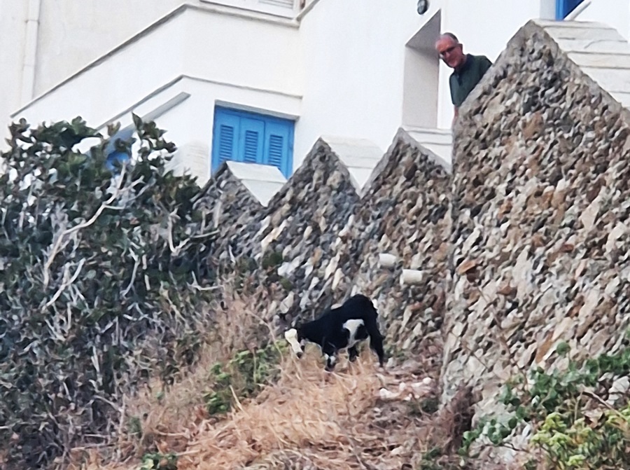 Τα ερωτήματα αρκετά. Πως είχε βρεθεί εκεί το αγριοκάτσικο; Άγνωστο. Πως πέρασε από τον πολύβουο Νειμποριό και την Πλακούρα; Άγνωστο. Τι ήταν αυτό που τράβηξε την προσοχή του και παρασύρθηκε να ανέβει στα απόκρημνα βράχια της Χώρας; Άγνωστό. Όμως εν κατακλείδι το λαμπερό και πολύχρωμο αγριοκάτσικο ήταν εκεί και βόλταρε αμέριμνο. Κι ο φίλος επισκέπτης ήταν εκεί την κατάλληλη στιγμή για να το φωτογραφήσει.