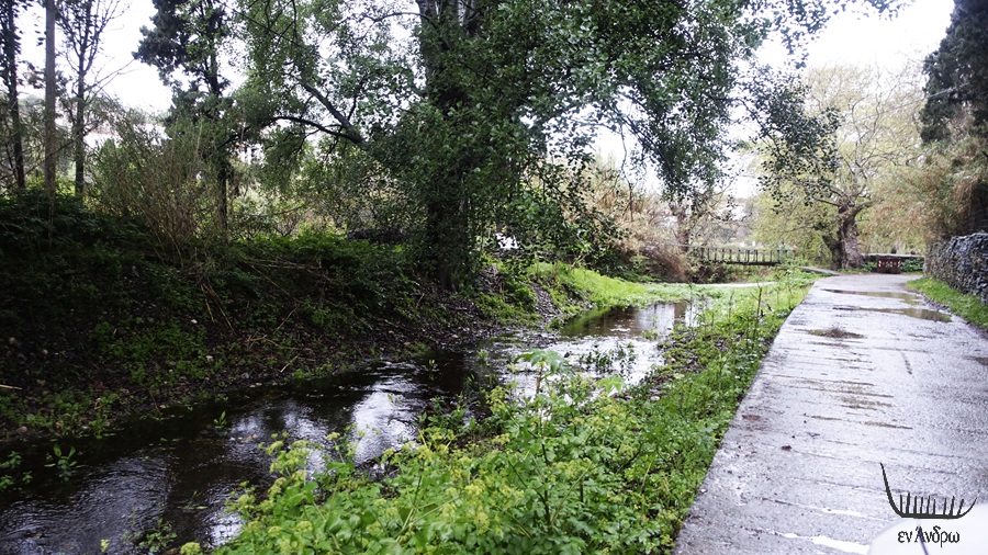 Στο ξύλινο γεφυράκι όπου η συμβολή του "ποταμού" με την υπερχείλιση της Αβύσσου η ροή ήταν πιο εμφανής. Σαν ψέματα. Και το ψιλόβροχο συνέχιζε.