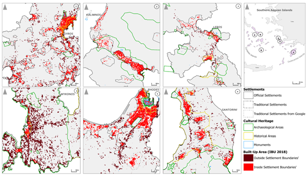 Ενδεικτική αποτύπωση της δόμησης εντός και εκτός ορίων οικισμών σε νησιά των Κυκλάδων και των Δωδεκανήσων και της γειτνίασής της με μνημεία και χώρους πολιτιστικής κληρονομιάς. Πηγή: συντάκτες της έρευνας