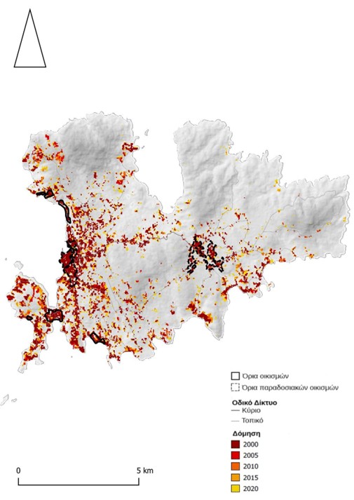 Στον χάρτη της ερευνητικής ομάδας του Πανεπιστημίου Αιγαίου αποτυπώνεται η εξέλιξη του δομημένου χώρου στο νησί της Μυκόνου από το 2000 μέχρι το 2020.