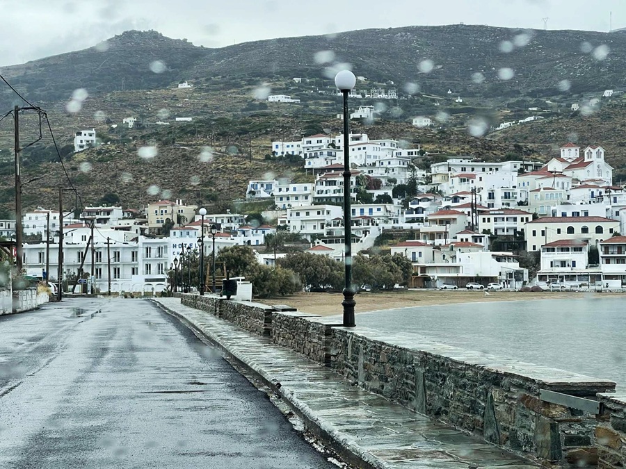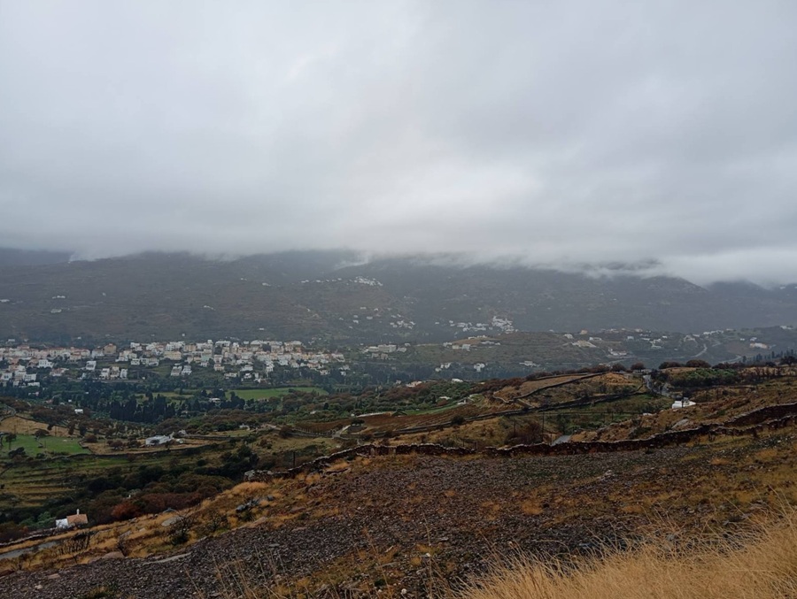 Βρέχει και στη Χώρα. Ποτιστική βροχή. Δεν συμπαρασύρει τα καμένα εδάφη της περσινής φωτιάς. Ελπίδα για αναγέννηση της γης.