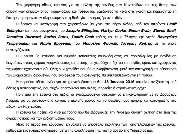 Μεγάλη έρευνα για την γνώση της βιολογίας και την επιστημονική κατανόηση της ζωής των νυχτερίδων διεξάγεται αυτές τις μέρες στην Άνδρο με την συνεργασία του Μουσείου Φυσικής Ιστορίας Κρήτης και πολλούς βρετανούς επιστήμονες. Η Άνδρος εκτός όλων των άλλων σημαντικών πλευρών της (ιστορία, ναυτοσύνη, μεσαιωνικά μονοπάτια, τουρισμό, κλπ) έχει ένα σπουδαίο περιβάλλον για το οποίο ενδιαφέρονται έλληνες και ξένοι επιστήμονες.