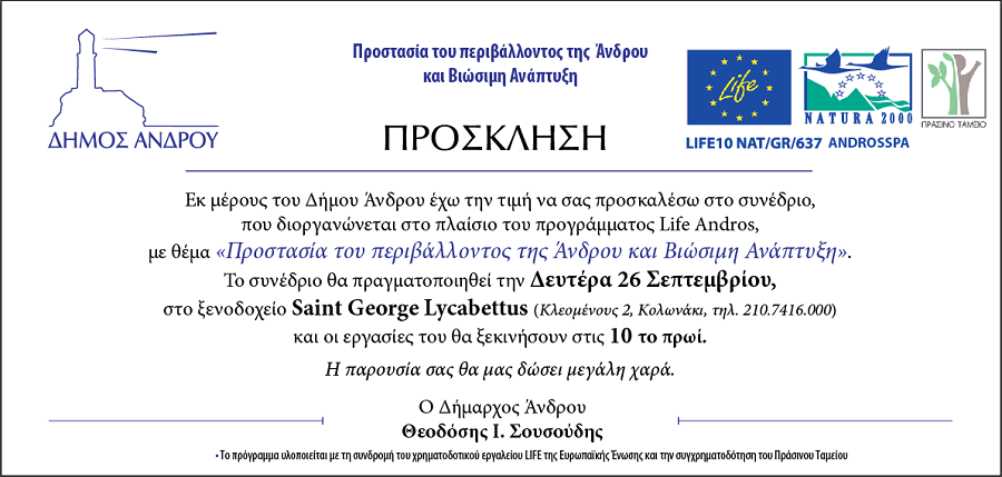 Εκ μέρους του Δημάρχου Άνδρου, κ. Θεοδόση Ι. Σουσούδη και στα πλαίσια του Ευρωπαϊκού Προγράμματος LIFEANDROSSPA,με μεγάλη χαρά θα θέλαμε να σας προσκαλέσουμε στο συνέδριο που θα πραγματοποιηθεί στην Αθήνα, στις 26 Σεπτεμβρίου 2016, με θέμα "Προστασία του περιβάλλοντος της Άνδρου και Βιώσιμη Ανάπτυξη".