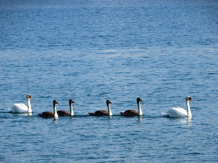 Μπροστά η μητέρα πυξίδα της οικογένειας. Ακολουθούν τα τέσσερα κυκνόπουλα. Τελευταίος ο πατέρας κλείνει την πομπή και ελέγχει την κατάσταση... (φωτ. Εν Άνδρω).