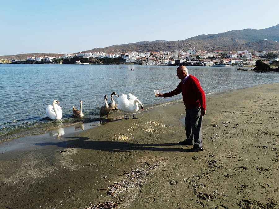 O κυρ-Γιώργος Κατσιώτης ταΐζει τους κύκνους (φωτ. Εν Άνδρω).