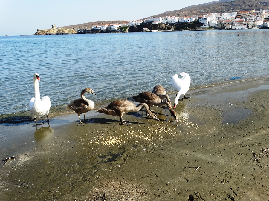 Ήρεμοι και φιλικοί οι κύκνοι με τους ανθρώπους πέρναγαν δίπλα από τους λίγους λουομένους... (φωτ. Εν Άνδρω).
