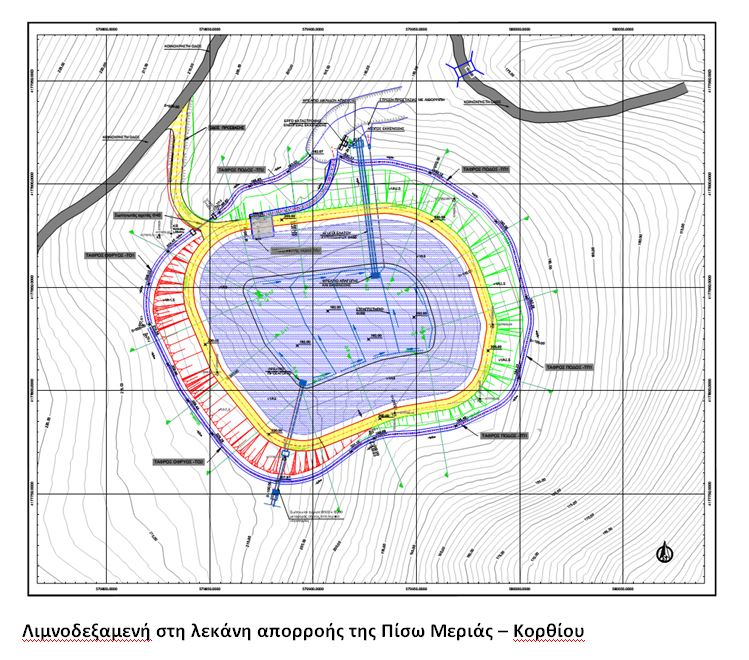 (3) Το έργο της Πίσω Μεριάς Κορθίου αφορά στην κατασκευή μιας χωμάτινης δεξαμενής χωρητικότητας 49.540μ3, στην οποία θα ταμιεύεται όγκος ύδατος που αντιστοιχεί σε μικρό ποσοστό του νερού που απορρέει μέσω του ρέματος της Πίσω Μεριάς. Η εν λόγω ποσότητα παροχετεύεται προς την Λιμνοδεξαμενή μέσω έργου υδροληψίας που κατασκευάζεται επί του προαναφερόμενου ρέματος (ανάντι της λιμνοδεξαμενής). Η ταμίευση θα γίνεται καθ’ όλη τη διάρκεια της χρονιάς ανάλογα με το ποσότητα της απορροής στο ρέμα της Πίσω Μεριάς.