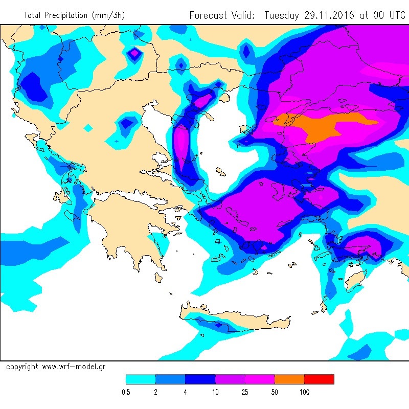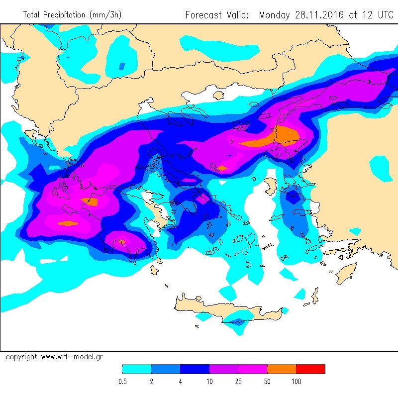 Χάρτης αναμενόμενης βροχής Δευτέρα 12:00 28/11/16