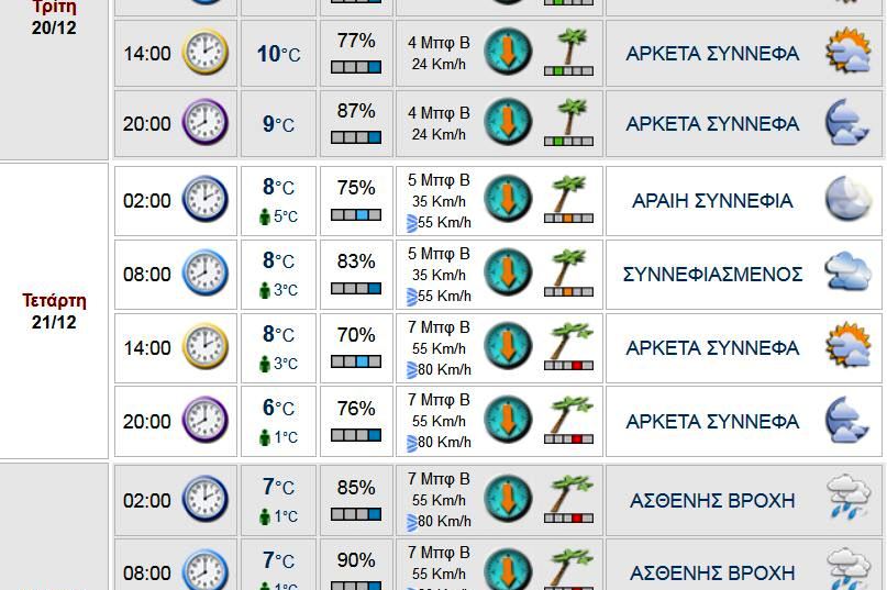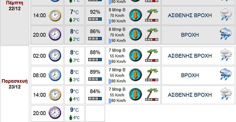 Από σήμερα Δευτέρα 19 Δεκεμβρίου, μέχρι και το Σάββατο 24 Δεκεμβρίου η θερμοκρασία θα κυμανθεί από 2 έως 9 βαθμούς Κελσίου. Οι βροχές θ αρχίσουν τα ξημερώματα της Τετάρτης και θα διαρκέσουν μέχρι την Παρασκευής.