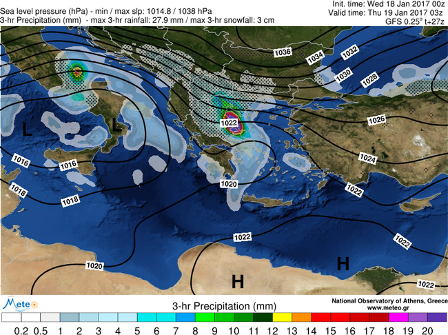 «Την Τετάρτη, 18/1 θα συνεχιστούν οι χιονοπτώσεις και βροχοπτώσεις σε όλη σχεδόν τη χώρα, με εξαίρεση τα Δωδεκάνησα και την Κρήτη, όπου αναμένονται μόνο αραιές νεφώσεις. Από το μεσημέρι τα φαινόμενα θα ενισχυθούν και θα εκδηλωθούν καταιγίδες, κατά τόπους ισχυρές, και πιθανώς χαλαζοπτώσεις. Τα ισχυρά φαινόμενα θα επεκταθούν από το απόγευμα σε όλη την Ελλάδα, πλην της ανατολικής Μακεδονίας και της Θράκης. Οι χιονοπτώσεις που θα σημειωθούν στα ορεινά των παραπάνω περιοχών, καθώς και σε περιοχές με χαμηλότερο υψόμετρο της δυτικής και κεντρικής Μακεδονίας, της Ηπείρου, και της Θεσσαλίας θα είναι κατά τόπους αρκετά πυκνές.