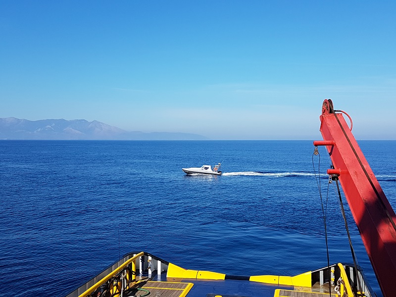 Το λιμενικό της Άνδρου με επικεφαλής τον λιμενάρχη Γιώργο Σίδερη ήταν παρών από στεριά και θάλασσα και επέβλεπε το έργο (φωτ. απεσταλμένος Εν Άνδρω).