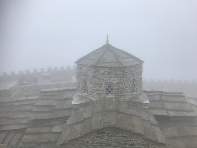 Δύο εντυπωσιακά στιγμιότυπα του τρουλου του καθολικού της Παναχράντου μέσα στην ομίχλη...