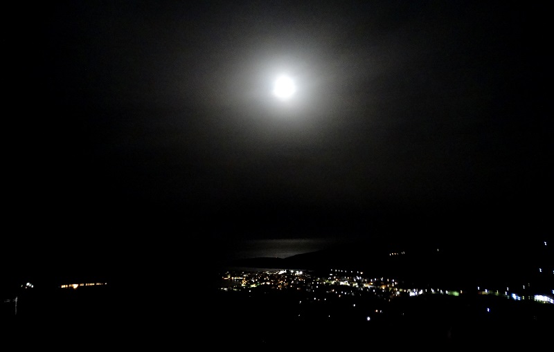 Η νύχτα πριν τον πρωινό σκονισμένο εφιάλτη. Τα φώτα της μικρής πόλης και το φεγγάρι πάνω της λένε την δική τους ιστορία στο Αιγαίο που ταξδέυει τις ζωές και τις σκέψεις μας μακριά (φωτ. Εν Άνδρω).