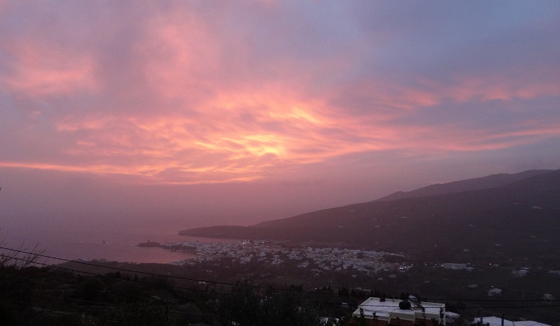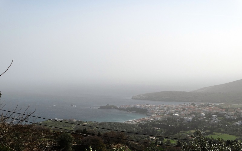 Άλλη μια σημερινή εικόνα της Χώρας και του Αιγαίου. Μισοσβησμένα όλα στο σκονισμένο σάβανο, που άπλωσε η Σαχάρα (φωτ. Εν Άνδρω).