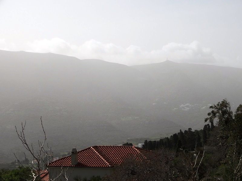 Απομεσήμερο. Οι Γερακώνες από το Υψηλού! Ανύπαρκτο σχεδόν το βουνό. Μια αχνοδιαγραφόμενη γραμμή. Και τίποτα άλλο. Όλα τα πλακώνει η Σαχάρα. Διακρίνονται αχνά μια-δύο συσταδες σπιτίων στα Φάλικα. Το μοναστήρι της Παναχράντου εξαφανισμένο. Το σάβανο της Σαχάρας τα έπνιξε όλα σήμερα (φωτ. Εν Άνδρω).