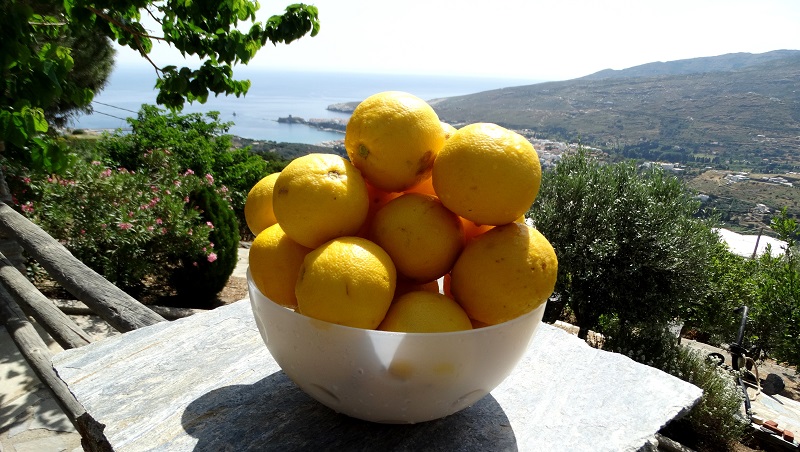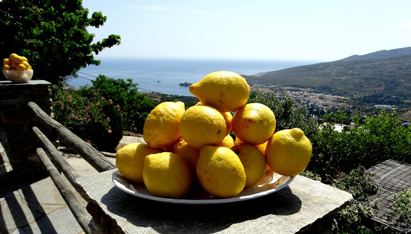 Και καθώς "ο κήπος έμπαινε στη θάλασσα" τα υπέροχα λεμόνια του Αντώνη Λιοπύρου, ενός από τους τελευταίους καλλιεργητές της γης της Άνδρου, άπλωναν κατακίτρινα πάνω από στο πράσινο και το γαλάζιο. Τα χρώματα της γης και ο καρπός της γης. Τα λεμόνια που επί εκατοντάδες χρονια χαρακτήρισαν την Άνδρο. Σήμερα τα κοιτά ένα ολόκληρο νησί και αναζητά - και μέσα από αυτά - κάτι από τις χαμένες ταυτότητες του (φωτ. Εν Άνδρω).