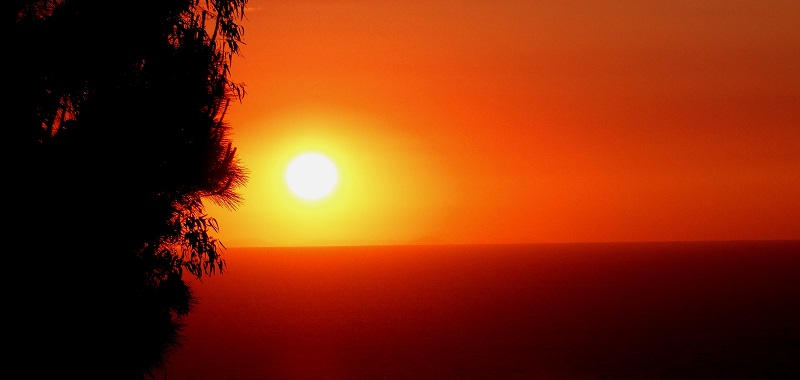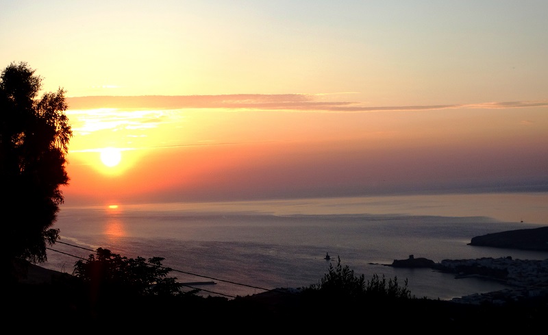 Ανδρος. Ανοιξιάτικο πρωινό. Μπροστά ορθάνοικτο το Κεντρικό Αιγαίο. Ο ήλιος χρυσοκόκκινος κυνηγά τις σκιές της νύχτας. Ο κήπος - μέσα από τον φακό - μοιάζει να κυκλώνει το πέλαγος. Ή, όπως έγραψε ο Ελύτης στις Μικρές Κυκλάδες - "ο κήπος έμπαινε στην θάλασσα"...  (φωτ. Εν Άνδρω).
