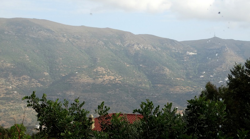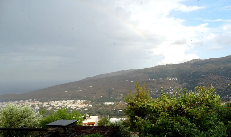 Την ώρα που βρέχει στη Χώρα και στο Υψηλού απέναντι στους Γερακώνες και στην Πανάχραντο έχει... ήλιο! Μετά από 15-20 λεπτά βρέχει στους Γερακώνες και δεν βρέχει πια στην Χώρα. Χαμηλά σύννεφα περνούν και ρίχνουν μια ποτιστική βροχή κατά τόπους... (φωτ. Εν Άνδρω).