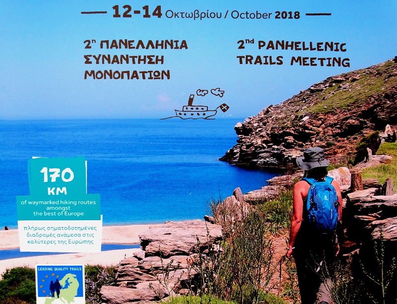 Στις 12 με 14 Οκτωβρίου παράλληλα με τις πεζοπορικές διαδρομές θα γίνει στην Άνδρο και η 2η Πανελλήνια Συνάντηση Μονοπατιών (2nd Panhellenic Trails Meeting) όπου θα γίνει ανταλλαγή εμπειριών μεταξύ περιοχών που έχουν πεζοπορικά μονοπάτια. Στην η αφίσα της διοργάνωσης σε φωτογραφία μας από το σημείο εγγραφης στο Γαύριο (φωτ. Εν Άνδρω).