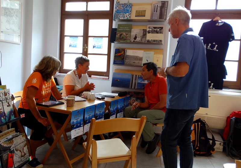 Το σημείο εγγραφής στο Γαύριο είναι το βιβλιοπωλείο του Γιώργου Αποστολίδη. Αν περάσετε πάρτε και κανένα βιβλίο. Βοηθά πολύ στην ξεκούραση μετά το περπάτημα! (φωτ. Εν Άνδρω).